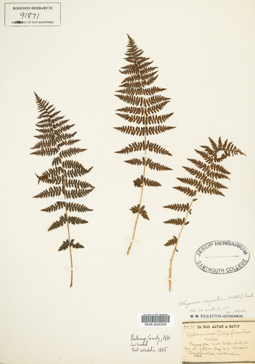 Now that the basic rules have been established, we can look at a real-world example of a plant species, present at the Hodgdon herbarium. The northern lady fern, Athyrium angustum, is abundant in the forests of New Hampshire. The genus name Athyrium is derived from the prefix a- (‘without’) and the word thyrium, a latinization of the Greek wordthyreos (‘shield’). The namesake of the genus is its seemingly invisible indusia, which cover the spore-producing sori on the undersides of fern leaves. The species name angustummeans ‘narrow’ and differentiates the northern lady fern from other lady ferns. The namesake of the species is its narrow fronds, or leaf structures, compared to other lady ferns.