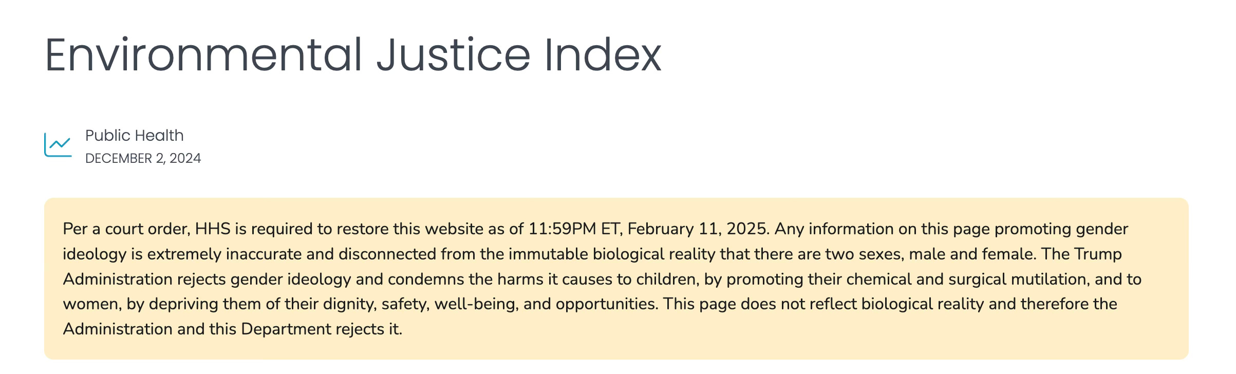 In early 2025, the Environmental Justice Index website1 was forcibly restored following a court order, with a disturbing disclaimer. The message, shown prominently on the ATSDR website, denounces “gender ideology” in politically charged language, signaling a broader shift: science is being sidelined by ideology.